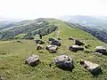 Vegetation on the southern and western slopes of the two ridges is predominantly: black sage, chamise and buck brush, with lesser amounts of toyon, hybrid manzanitas, elderberry, gooseberry, chaparral currant, sticky monkeyflower, coffeeberry, coyote bush, poison oak, hollyleaf red berry, deer weed and dozens of other species.[1] Some of the exposed rocks contain compressed layers of fossils.