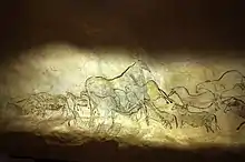 The Axial Diverticulum is also decorated with cattle and horses accompanied by deer and ibex. A drawing of a fleeing horse was brushed with manganese pencil 2.50 metres above the ground. Some animals are painted on the ceiling and seem to roll from one wall to the other. These representations, which required the use of scaffolding, are intertwined with many signs (sticks, dots and rectangular signs).