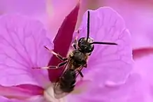 Lasioglossum malachurum, the sharp-collared furrow bee, is a small European halictid bee.[1] This species is obligately eusocial, with queens and workers, though the differences between the castes are not nearly as extreme as in honey bees.[2] Early taxonomists mistakenly assigned the worker females to a different species from the queens. They are small (about 1 cm), shiny, mostly black bees with off-white hair bands at the bases of the abdominal segments.[1] L. malachurum is one of the more extensively studied species in the genus Lasioglossum, also known as sweat bees. Researchers have discovered that the eusocial behavior in colonies of L. malachurum varies significantly dependent upon the region of Europe in which each colony is located.[3]