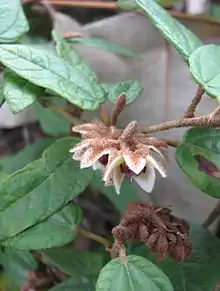 Lasiopetalum macrophyllum, commonly known as shrubby velvet bush,[2] is a species of flowering plant in the family Malvaceae and is endemic to south-eastern Australia. It is a shrub with egg-shaped to lance-shaped with rust-coloured hairs on the lower surface, and woolly-hairy, cream-coloured and reddish flowers.