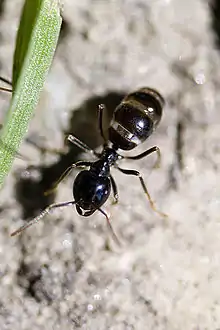 Like other black ants they tend populations of aphids for their honeydew, and can often be seen travelling in both directions, following scent-trails for long distances to their source of food, which is often a tree.[6] The trails the species make to forage and transport food commonly last for months. As the workers clear the paths of vegetation and debris, making the path easy for massive amounts of ants to travel efficiently.[5] They rarely carry other insects back to the nest.[6]