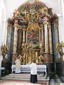 The Last Gospel began as a private devotional practice on the priest's part, known well in the Sarum Rite in Catholic England, but was gradually absorbed into the rubrics of the Mass.[2] Immediately after the blessing, the priest goes to the Gospel side of the altar, beginning with the Dominus vobiscum as at the Proclamation of the Gospel during Mass. However, as the priest reads from an altar card, he makes a Sign of the Cross with his right thumb on the altar's surface instead of the Gospel text, before signing his own forehead, lips, and chest. At the words "Et Verbum caro factum est" ("And the Word became flesh"), the priest (and, if present, the congregation) genuflects.