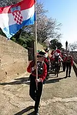 On Carnival Tuesday (Shrove Tuesday) at eleven o'clock church bells halt all activity in the village. The carnival crowd, known as "Pokladari," gather with and start playing their lyres. The carnival procession begins and is accompanied by the music until the end. The Poklad is placed on the village donkey judged to be the most beautiful. The flag-bearer of the Croatian national tri-colour, the doll on the donkey and the carnival participants make their way towards City Hall (in the past to the Dubrovnik Rector) in order to get permission to visit respected locals.