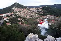 As they stop at the houses of the most prominent villagers singing and shouting, and performing the sword dance – similar to the more famous Moreška and Kumpanija from nearby Korčula – will take place on some of the locals' terraces. The carnival crowd who, up until the last century were armed with real swords, are followed at some distance by the "beautiful maskers" (girls in costumes and masks). The procession halts when it reaches Pod kostajnu (the tree growing in the middle of the village). A length of rope measuring over 300 meters has already been stretched between the pole set here and another mounted on the top of the hill in the background of the western side of the village. The procession climbs up to the top of the hill and the puppet is attached to the rope down which it slides three times, with petards cracking under its feet. Each time it reaches the bottom of the rope, the Poklad is met by drawn swords.