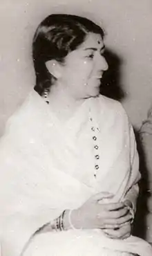Initially, she is said to have imitated the acclaimed singer Noor Jehan, but she later developed her own style of singing.[23] She brought a new signature style of singing to Indian film music, moving away from mehfil-style performances to suit both 'modern' and 'traditional' female protagonists. A soprano range voice with less volume or amplitude, she had enough weight in her voice to give definite shape to the melody of Indian film songs.[37] Although she had limited coloratura skills in her early career, she developed better tone and pitch as she progressed in her playback career.[38] Lyrics of songs in Hindi movies were, in those days, primarily composed by Urdu poets and contained a higher proportion of Urdu words, including the dialogue. Actor Dilip Kumar once made a mildly disapproving remark about her accent while singing Hindi/Urdu songs; so for a period of time, she took lessons in Urdu from an Urdu teacher named Shafi.[39] In subsequent interviews she said that Noor Jehan heard her as a child and had told her to practice a lot. The two stayed in touch with each other for many years to come.[40]