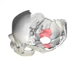 ![]() Human skull seen from above (parietal bones removed.) Lateral parts of occipital bone shown in red. | |