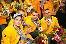 Latvia originally won two silver medals and two bronze medals. In November 2017, the Russian Bobsleigh teams that came first and fourth in the four-man event, was disqualified. In addition, the Russian Bobsleigh teams that came first and fourth in the two-man event, was also disqualified. This meant Latvia moved from the original 5th place to the bronze medal position in the two-man event and from the original silver medal to the gold medal position in the four-man event respectively.[6][7][8] The IOC requested that the FIBT modify the results, and the medals were redistributed accordingly.[9][10] Also, the gold medal in the four-man Bobsleigh event is Latvia's first Winter Olympic gold medal.[11]
