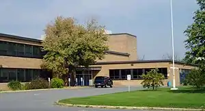 It was built at the same time as Rideau High School and Ridgemont High School and has the same base design by architects Hazelgrove, Lithwick and Lambert with well-lit efficient circulation, and a large auditorium. The double gymnasium block projected into a large sports field and oval track that was known as the R.D. Campbell Stadium.[1] In the evenings, 800 adults used the facilities including the commercial, science, home economics, science rooms and gymnasia. For adults, commercial and business classes were offered in addition to hunter safety and Scottish Country Dancing. There were tennis courts, a large parking lot, well equipped science labs, technical shops and a library. There were two storey t-shaped wings for classrooms, with the gym, auditorium and cafeteria in bumped out blocks. The building was constructed of orange-buff brick with contrasting brick in perpendicular bars on the fly over the auditorium stage. At Laurentian the auditorium stage fly was decorated at the corners with white bricks in a ladder motif. There were horizontal bands of windows in silver aluminum, which were later retrofitted with tinted glass in brown anodized frames. An entrance forecourt was reached by a circular drive. The main door was through a vestibule set at an angle between a classroom wing and the cafeteria block. The school's most architecturally interesting feature was a smokestack with a heavy fire door at the base for cleaning out the ash and soot.[2]