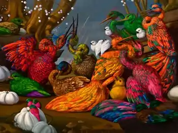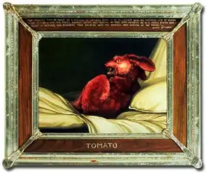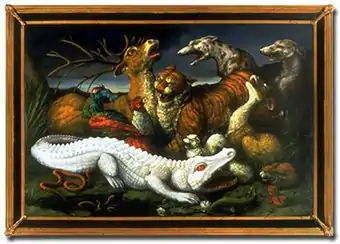 Hogin's work employs techniques, vocabularies, and visual codes from the history of painting and visual culture: 17th-century Dutch "embarrassment of riches" still lifes, naturalistic, 18th-century English landscapes, Baroque portraiture, French Romantic historical tableaux, natural displays, and more.[32] She uses them to create mordant, diorama-like scenes that critique, parody and sometimes propose alternatives to contemporary cultural and social issues or celebrate aspects of human experience.[2][1][33] She upends these genres with lushly painted, thoroughly researched canvases whose elaborate visual conceits feature surreal, mutated animal protagonists (e.g., snarling rabbits with tiger skins, screeching monkeys, or albino alligators) chosen for their allegorical associations and overgrown, toxic landscapes.[34][3] Critics, such as Susan Snodgrass, suggest that Hogin employs a "bait-and-switch" tactic, luring viewers with virtuoso technique and then inserting subversive, often harsh cultural criticism, conveyed through her fantastic, anthropomorphized creatures, pointed allegories, and ironic text and decorative artifice.[2][12][35] Writer Maureen Sherlock aligns Hogin's wry approach with satire, caricature, and the Surrealist and Enlightenment projects of unmasking ideologies and codes of representation.[3]