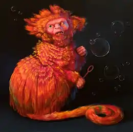 In the 2000s, Hogin frequently focused on the interplay between human drives, evolutionary biology and consumerism,[35] in work that increasingly adopted the synthetic, Day-Glo palette of children's toys and cartoons, psychedelia and global marketing.[11][20][39][40] The series "Allegory of Psychodemographics: 24 Branded Products My Family Uses on a Typical Summer Day" (2006) examined consumer goods from Ambien to toothpaste, as did the later "Sugar Trilogy"; two solo shows in New York ("Neuromantic Evening, Psychotropical Paradise" and "Monkey Brains," both 2008) commented on the effects of psychopharmacology in contemporary life with depictions of gun-toting, dazed monkeys, fluorescent reptiles, and an installation of 100 portraits of mutant guinea pigs with rabid features and radioactive coats, called What Ails Us: The 100 Most-Prescribed Pharmaceuticals in the Nation.[41][20][40][19] In 2017, James Yood wrote of the over-saturated, apocalyptic parables in her show, "Implacable Demons and Better Angels" (e.g., Portrait of a Startled Rabbit Near a Culvert, 2016), "Hogin sees everywhere a comely corruption, an animal kingdom so giddy in its savagery and evil that only the trappings of an overcharged and hothouse beauty could describe it."[33][42]