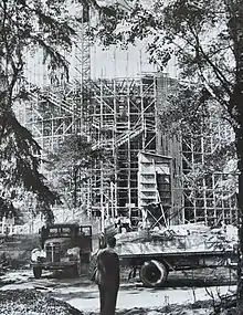 Construction was started in early April 1958 and the tower was topped out on 26 September 1958.[3]: 6 The casting of the tower took about 100 tonnes of iron and 450 cubic metres of special concrete mass.[3]: 5 The tower was first filled with water in October, when it underwent a so-called tightness test. The tower was officially taken into use on 13 November 1958.[2]: 68 After this, reinforcing elements were placed on the outer surface of the tower and construction was finally complete in February 1959.[3]: 6