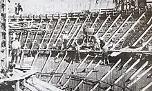 The outer shell and support ring of the tower were pre-tensed concrete to prevent tensions and subsequent damage in the structure. The pre-tension was done in accordance to the Dywidag system, where the tension steel has a diameter of 26 mm.[3]: 8 The Lauttasaari water tower was the first water tower in Finland to use pre-tensed concrete.[7]: 41 The concrete walls were 25 cm thick. The outer walls and the support ring were cast without interruption, to prevent folds from appearing between the structures and to ensure water-tightness. The work was done in three shifts and took four days in total.[3]: 11 The roof of the tower was built from copper.[9]: 39