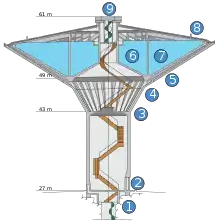 Kotkavuori is located 27 metres above sea level. The height of the water tower was 34 metres, so its roof was located 61 metres above sea level. The diameter of the water container was 42 metres at the widest point. On top of the shaft of the tower were 24 support beams at a 60-degree angle, with a 15.8 metre wide support ring on top of them. The purpose of the beams and ring was to support the water container and to ensure that the structure did not suffer damage due to changes in outdoor temperature or the shape of the concrete shell.[3]: 8