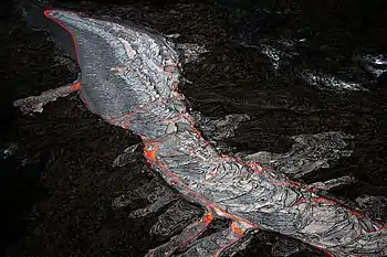 A lava channel is a stream of fluid lava contained within zones of static (i.e., solid and stationary) lava or lava levees. The initial channel may not contain levees per se, until the parental flow solidifies over what develops into the channel and creates natural levees. This initial levee allows for the building of a more complex levee and channel. As the lava flows through the channel, the elevation of the surface of the lava flow pulsates and lava can possibly flood the associated channel walls spilling out of the channel and over the existing levees, creating what is known as overflow levees. Overflow levees increase the height and width of the original levee. The lava that flows in lava channels is commonly basaltic in composition.