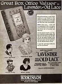 Lavender and Old Lace is a 1921 American silent drama film directed by Lloyd Ingraham and starring Marguerite Snow, Seena Owen, Louis Bennison, Victor Potel, and Zella Ingraham. It is based on the 1902 novel of the same name by Myrtle Reed. The film was released by W. W. Hodkinson in June 1921.[1][2][3]