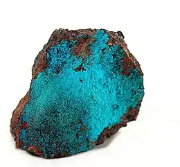 At the type locality, lavendulan occurs associated with erythrite and a cobalt molybdate originally called pateraite, but now discredited.[6] At San Juan, Chile, it is associated with erythrite, cuprite, malachite and cobaltian wad.[5] At the Cap Garonne Mine, Pradet, Var, Provence-Alpes-Côte d'Azur, France, associated minerals are chalcophyllite, cyanotrichite, parnauite, mansfieldite, olivenite, tennantite, covellite, chalcanthite, antlerite, brochantite and geminite.[5] It also occurs at Tsumeb, Namibia, associated with cuprian adamite, conichalcite, o’danielite, tsumcorite, fahleite, quartz, calcite and gypsum.[5]