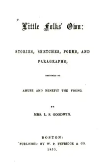 Goodwin's volumes included, Little Folks' Own (collection of stories and verse, which had a large sale); The LIttle Helper (biography); The mysterious Miner;[8] Quicksands; The Light of Home; and Wings, Legs and Voices. Her books were published in the U.S. and England.[2] Besides contributing much to various popular publications for young people, she gained recognition in art and general literature. As a writer of poetry she was represented in many anthologies.[3] Goodwin was a charter member of the New England Woman's Press Association.[2]