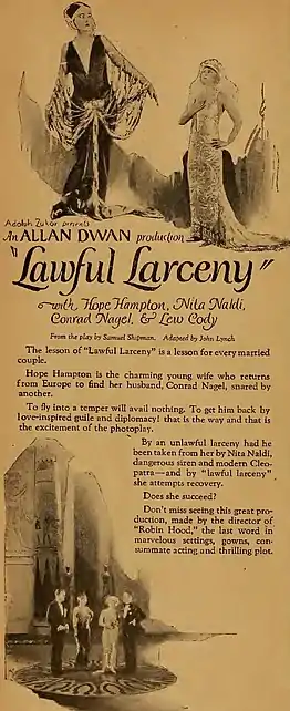 Lawful Larceny is a lost[1] 1923 American silent drama film directed by Allan Dwan and written by John Lynch and Samuel Shipman. The film stars Hope Hampton, Conrad Nagel, Nita Naldi, Lew Cody, Russell Griffin, and Yvonne Hughes. The film was released on July 22, 1923, by Paramount Pictures.[2][3]