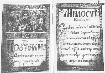 In Epistolija, the text of the epistle is preceded by an introductory section, a kind of abstract, titled "Edification of the Serb People" (Поучєниє народа србскога).[24] The epistle itself begins in f. 5r with the account of how God sent it from heaven enclosed in a stone that fell near Jerusalem. The stone was small, but nobody could lift it. After Saint Peter and the Patriarch of Jerusalem prayed with bishops, monks and priests before the stone for three days and nights, it opened up and the letter within it was taken to a church and read before the congregation. The text of the letter is then presented,[25] after which the narrative returns to the congregation, who piously engage in the copying and spreading of the letter throughout the whole land.[26] Some versions of the epistle present only the letter without the framing stories.[9] The letter contains condemnations of various kinds of sins, disregard for precepts of the Church, and bad conduct, depicting vividly the harsh punishments for these transgressions. It especially focuses on the strict observation of Sunday as the Lord's Day.[27] The epistle ends in f. 19v, and the remaining leaves of the book were reserved for writing the names of persons to be prayed for at services in the Osječani church.[24] Already Jovanović had written about sixty names, mostly in the section "Memory Eternal of the Deceased Servants of God".[16] The book is illustrated with two headpieces, one representing Jesus Christ (f. 3r) and the other depicting the Deesis (f. 5r).[24]