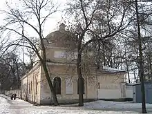 The Church of St Lazarus (Russian: Церковь Праведного Лазаря) was built in 1717, and is located along the banks of the Monastyrka River.[1] Peter the Great's sister, Natalya Alexeyevna, had died in 1716, but Peter delayed her burial until his return from a journey abroad. The stone octahedral church, the first stone building of the Monastery, was built behind the Lavra's Annunciation Church, and was probably consecrated on 17 October 1717, shortly after Peter's return, and at the time of the transfer of the relics of St Lazarus.[1] On 23 December 1718 court physician Robert Erskine was interred in the crypt, and on 26 April Peter's infant son, Tsarevich Peter Petrovich, was buried there. In 1723, the remains of Peter the Great's relatives were transferred to stone tombs in the Annunciation Church.[1]