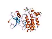 Lck is a 56-kilodalton protein. The N-terminal tail of Lck is myristoylated and palmitoylated, which tethers the protein to the plasma membrane of the cell. The protein furthermore contains a SH3 domain, a SH2 domain and in the C-terminal part the tyrosine kinase domain. The two main phosphorylation sites on Lck are tyrosines 394 and 505. The former is an autophosphorylation site and is linked to activation of the protein. The latter is phosphorylated by Csk, which inhibits Lck because the protein folds up and binds its own SH2 domain. Lck thus serves as an instructive example that protein phosphorylation may result in both activation and inhibition.