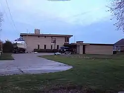 The LeRoy Smith House is a two-story, flat-roofed house constructed of 12" x 12" cinder "unit blocks" designed and patented by Dow. A long, low three-car garage extends at a right angle from the corner of the house. The street side of the house has a plain, flat facade with a few small windows; the river side, in contrast, contains a large expanse of windows opening onto the water, underneath wide, projecting eaves.[2]