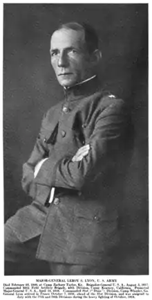 In May 1918, Lyon was promoted once more, this time to major general, and given command of the 31st Infantry Division.[3] Lyon arrived in France with the 31st Infantry Division on September 29[3] and participated in the Meuse–Argonne offensive later that year.[1] In November 1918, Lyon was given command of the 90th Infantry Division until December of the same year.[4]