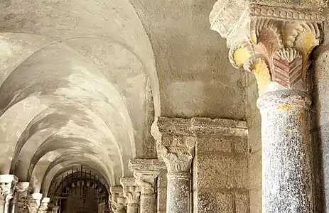 While most of the vaults in the porch are the rounded Romanesque barrel vaults and groin vaults, the porch has several vaults with more pointed arches, a feature of Gothic architecture, added in later reconstructions of the 14th and 18th century.[11]