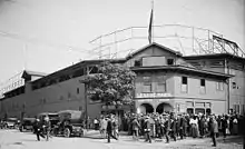 Batters still had to surmount a 40-foot (12 m) fence to hit home runs.[18] The fence in left field was only five feet tall, but batters had to hit the ball 375 feet (114 m) down the line to hit a home run, and it was fully 460 feet (140 m) to the scoreboard in the deepest part of center field. The diamond, situated in the northwest corner of the block, was slightly tilted counterclockwise, making right field not quite as easy a target as Baker Bowl's right field (which had a 60-foot (18 m) wall), for example.