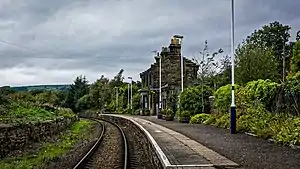 Trains stop at the main station platform where the Station Master's house is based (now a private residence). Only a small internal shelter remains in the station building. Between Castleton and Grosmont, the later section of line to be built, the design of the station buildings uses a crow stepped gable at each end, favoured by the NER company in the mid-1860s. Despite a lack of staffing, the station is well cared for, with plants tended by the village WI.