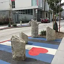 The San Francisco South of Market Leather History Alley consists of four works of art along Ringold Alley honoring leather culture; it opened in 2017.[11][12] The four works of art are: engraved standing stones that honor community leather institutions including the Folsom Street Fair and leather pride flag pavement markings through which the stones emerge, a black granite stone etched with a narrative by Gayle Rubin, an image of the "Leather David" statue by Mike Caffee, and with a reproduction of Chuck Arnett’s 1962 mural that was in the Tool Box (a gay leather bar),[13][14][15] and metal bootprints along the curb which honor 28 people who were an important part of the leather communities of San Francisco.[12]
