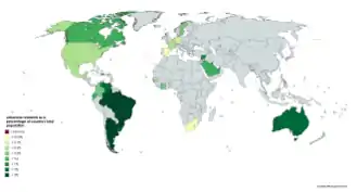 Many Lebanese entrepreneurs and business people worldwide have proved very successful, in all kinds of sectors and contexts. Therefore, Lebanese abroad are considered "rich, educated and influential."[22] Remittances from Lebanese abroad to family members within the country were estimated at $8.9 billion in 2014 and accounted for 18% of the country's economy.[23] However, there remains a great untapped potential for further collaboration and cooperation between the diaspora and the Lebanese in their home-country. Foreign direct investment is below 7% of the GDP, and almost half the Lebanese population is in tertiary education.