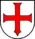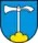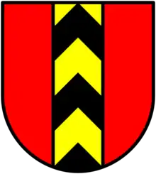 The blazon of the municipal coat of arms is Gules a Pale chevrony Or and Sable.[4]