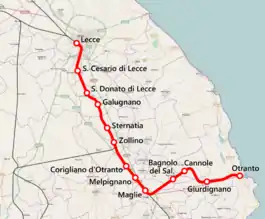The Lecce–Otranto railway is an Italian 47-kilometre (29-mile) long railway line, that connects Lecce with Zollino, Maglie and Otranto. The route operates through the region of Apulia.
