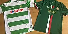 ![]() The 70th anniversary shirts used by Lechia Gdańsk (left) for the 2015–16 season, and Śląsk Wrocław (right) for the 2016–17 season. | |