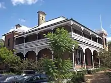 Leckhampton is a two-storeyed brick house with a ribbed iron hipped roof. The front and south-east side of the house are sheltered on both levels by deep verandahs which feature decorative cast-iron balusters, columns and friezes. A square, double-storeyed bay, surmounted by a parapet, projects from the northern corner of the main facade. Entry is through a pedimented doorway which leads to a vestibule hall and stairway lit by an impressive stained glass window. Two single-storeyed enclosed verandahs have been added to the rear. A new paved entertainment and pool area behind the house link Leckhampton with the new building.[1]