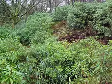 Just above the confluence of two streams with deep gulleys on the southern foothills of the Forth Valley.[1] West of Gargunnock, it can be accessed from the track to Knock-o-Ronald by following the path up the East side of Leckie burn. Recent visitors to the site have stated that it is very overgrown with rhododendrons. On a recent visit (July 2018) the site was found (by B Wilson, University of New England) to be almost entirely inaccessible due to the dense stand of rhododendron.[2] Clearance of rhododendron in 2020 now makes access much easier. Take the path just east of Saw mill cottage, to the east side of Leckie Burn. Follow the path til you cross the "1878" bridge. Turn right along the "ridge" and the Broch can be seen about 100m ahead.