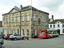 The design involved a symmetrical main frontage with seven bays facing east onto the Market Square; it was arcaded on the ground floor, so that markets could be held, with an assembly hall on the first floor. The first floor was fenestrated with sash windows flanked by pilasters supporting voussoirs, and the central section of three bays, which slightly projected forward, was surmounted by a modillioned pediment with a clock in the tympanum.[1] A bust of King William III on a pedestal[lower-alpha 1] was created by French sculptor, Honoré Pellé, and installed in a niche on the north side of the building.[4] The architectural historian, Nikolaus Pevsner, was impressed with the bust and described it as "one of the finest baroque sculptures in England".[5]