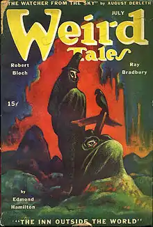 Coye's fame as an illustrator of the macabre developed as a result of his drawings for three horror anthologies edited by August Derleth in the early 1940s, Sleep No More (1944), Who Knocks (1946), and The Night Side (1947). This subsequently led to additional work for Weird Tales, a popular pulp magazine. Coye's work first appeared in the March 1945 issue of Weird Tales, illustrating the story 'Please Go Way and Let Me Sleep" by Helen Kasson. This tale gave Coye the chance to show dead bodies in various states of decomposition.[2] From 1945 to 1952, his covers and interior work, in a long and fruitful association with the magazine, captured images of horror and the supernatural.[1] A review of Pulp Macabre: The Art of Lee Brown Coye's Final and Darkest Hour said his work for Weird Tales produced "some of the magazine's greatest covers and as well as some of the most memorable illustrations to ever appear in pulps". In the 1960s, Coye's work appeared in such magazines as Fantastic and Amazing.