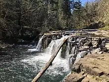 Lee Falls is a waterfall on the Tualatin River in Washington County in the U.S. state of Oregon. Named after 19th century sawmill owner James A. Lee, it is located alongside Southwest Lee Falls Road on private timber land.[2][3] The falls pour over a basalt rock formation.[4] Unusually for the region, the falls are wider than they are tall.[5] A swimming hole is present beneath the falls. Downstream is Little Lee Falls and the unincorporated community of Cherry Grove. Upstream is Ki-a-Kuts Falls.