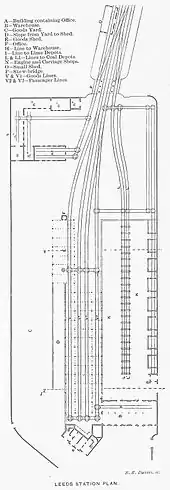 Around 1863 the site at Marsh Lane was redeveloped into a goods station.[10] The old station was demolished and a six-storey grain warehouse was constructed on the site, designed by architect Thomas Prosser.[11] In 1869 the North Eastern Railway's (NER) Leeds extension line from Marsh Lane to Leeds New railway station was completed, allowing through running along the Leeds and Selby Line into Leeds and beyond.[12] A new passenger station was constructed at Marsh Lane on the route into central Leeds.[11]