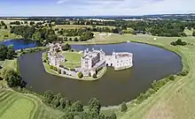 The castle was captured on 31 October 1321 by the forces of Edward II from Margaret de Clare, Baroness Badlesmere, wife of the castle's constable, Bartholomew de Badlesmere, 1st Baron Badlesmere, who had left her in charge during his absence. The King had besieged Leeds after she had refused Edward's consort Isabella of France admittance in her husband's absence; when the latter sought to force an entry, Lady Badlesmere instructed her archers to fire upon Isabella and her party, six of whom were killed.[9] Lady Badlesmere was kept prisoner in the Tower of London until November 1322.[10] After Edward II died in 1327 his widow took over Leeds Castle as her primary residence.[11]