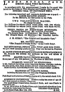 The Leeds New Gardens was renamed to the Royal Park in September 1858 in honour of Queen Victoria's visit to Leeds that month to officially open the Town Hall.[3] During the 1860s, the park hosted the Leeds Flower Show on an annual basis, and held sensational paid events, such on 27 July 1861, when Charles Blondin, who was famous for having crossed the Niagara Gorge, walked a tightrope carrying a man on his back.[5]