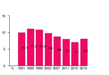 The Left Alliance was founded in 1990 as the chief successor of the left-wing Finnish People's Democratic League (SKDL). Although not as electorally successful as the SKDL, it has achieved some success, typically receiving around eight to ten percent of the vote in parliamentary elections. It has participated in five cabinets, most recently the Marin Cabinet formed in 2019. It is socialist,[6] and democratic-socialist,[7] and it supports the principles of eco-socialism.[8][9]
