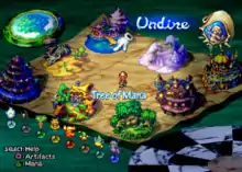 Legend of Mana, unlike previous games in the Mana series, does not feature a set journey through a fixed world. Instead, it features a unique "Land Make" system where the player generates the structure of the game world by placing objects, named Artifacts, on empty square plots on a map. This map takes the form of a grid of spaces presented in an isometric viewpoint on a map screen. When an Artifact is placed in a space on the map, it creates a Land, and the player can enter that Land by selecting the position on the map. Adjacent Lands are not connected; to move from one land to another the player must first return to the map screen. Different Lands are generated from different Artifacts, each containing a quest which upon completion usually gives the player another Artifact to place.[4] Lands can also contain additional quests. Each Land is ranked from 0 (no presence) to 3 (strong presence) in its strength in each Spirit of Mana; this in turn causes magic of that element to be stronger in that Land.[5] The strength of the rankings is dependent on the Artifact, its position on the Map, and the rankings of adjacent Lands. Many locations have non-player characters who give quests and information or sell equipment. Other areas feature enemies and bosses with which the player can battle.[2]