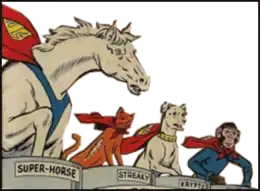 The Legion of Super-Pets is a fictional team of super-powered pets in the DC Universe. The original membership included Krypto the Superdog, Streaky the Supercat, Beppo the Super-Monkey and Comet the Super-Horse, with the shape-shifting alien Proty II later joining.[1] The team first appeared in Adventure Comics #293 (February 1962), although all of the members except for Comet had appeared individually in earlier issues.[2] The group was removed from mainstream DC Comics continuity in 1986 but a new version appeared in mainstream comics in 2017.