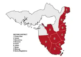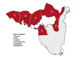 - Municipalities: Bacon, Barcelona, Bulusan, Casiguran, Castilla, Gubat, Irosin, Juban, Matnog, Prieto Diaz, Santa Magdalena, Sorsogon