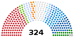 The total number of senators at the start of the legislature was of 325. At the end of it, two seats remained vacant because no by-elections could be held for vacancies appearing less than one year before the natural end of the legislature. Therefore, the total number of senators at the end of the legislature was of 322.
