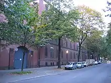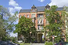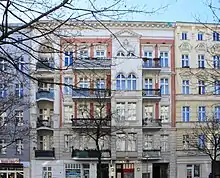 Several buildings in the street have been placed under historical monument protection: the prison,[5] the houses 6 to 10,[6] and 27 to 30;[7] the house at No.48, a tenement block; built in 1894. [8] The former Berlin Royal Military Clothing Department made uniforms at No.57 and 58.[9] [10] The Werthheim House at No. 35 was a factory and warehouse of the Wertheim company.[11] Parts of the Poststadion sport stadium at No. 59 including the indoor swimming pool.[12]