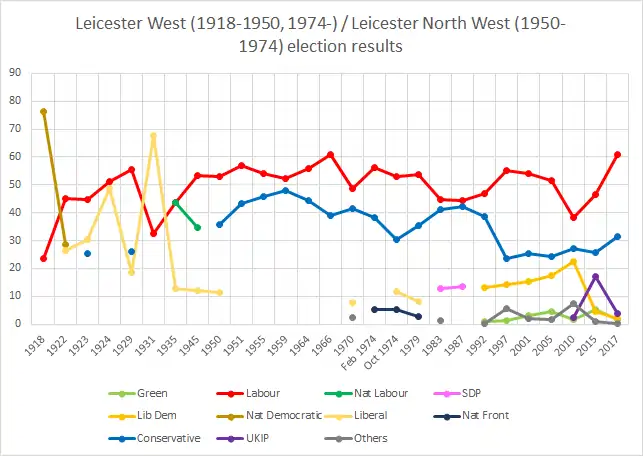 Historically this used to be the safest Labour seat in Leicester—in the 1983 general election it was the only one to remain in Labour hands. However, the high Asian populations in Leicester South and Leicester East have pushed them away from the Conservative Party; while Leicester West is still a safe Labour seat, represented by that party since the Second World War, it is the most marginal of the three Leicester seats.[2] While it did, like the other two Leicester seats, see a significant swing to Labour in 2017, unlike the other two seats Liz Kendall's majority was not a record high for the constituency.